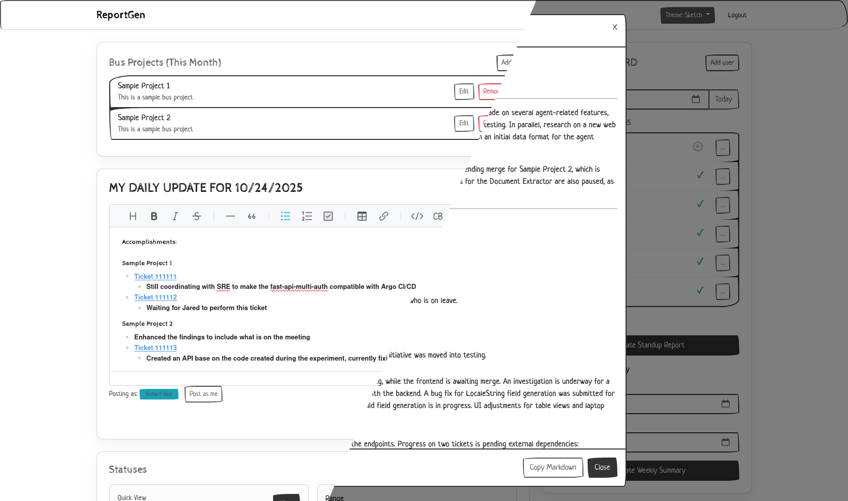 A Laravel-based team status reporting application. It helps teams capture daily updates, compile weekly summaries, and share consolidated reports quickly. The core web app lives in reportgen/ and provides: