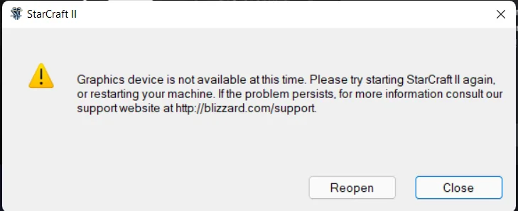 This setup works for most Blizzard games I occasionally play (Warcraft III: Reforged, Diablo II: Resurrected, and StarCraft: Remastered). StarCraft II is the odd one out: it fails at startup with a "graphics device not available" error.