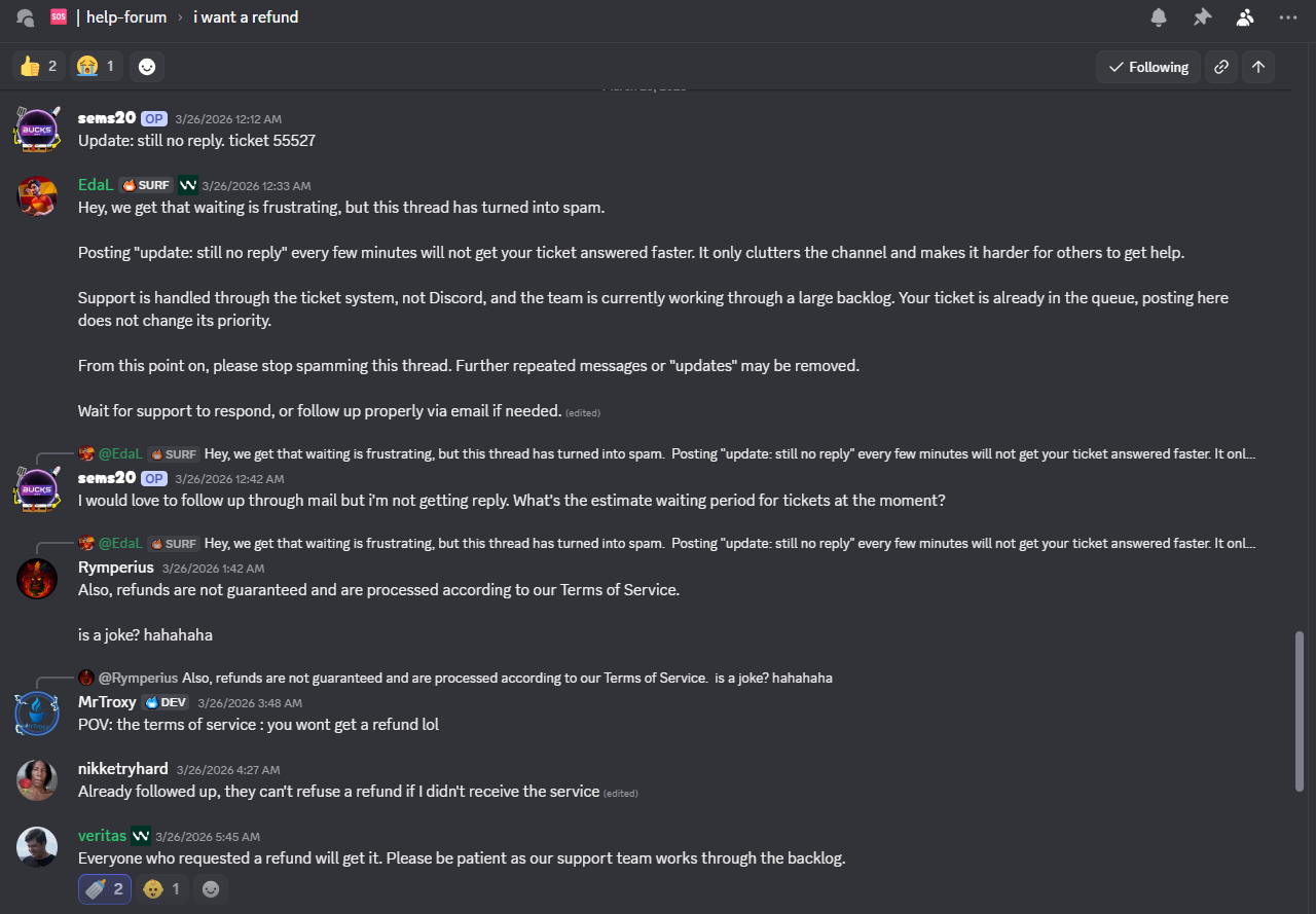 That was a while ago. I'm still waiting. And based on what I've seen in community threads, with other users asking the same question and staff responses that amount to "refunds are processed according to our Terms of Service," I'm not holding my breath.